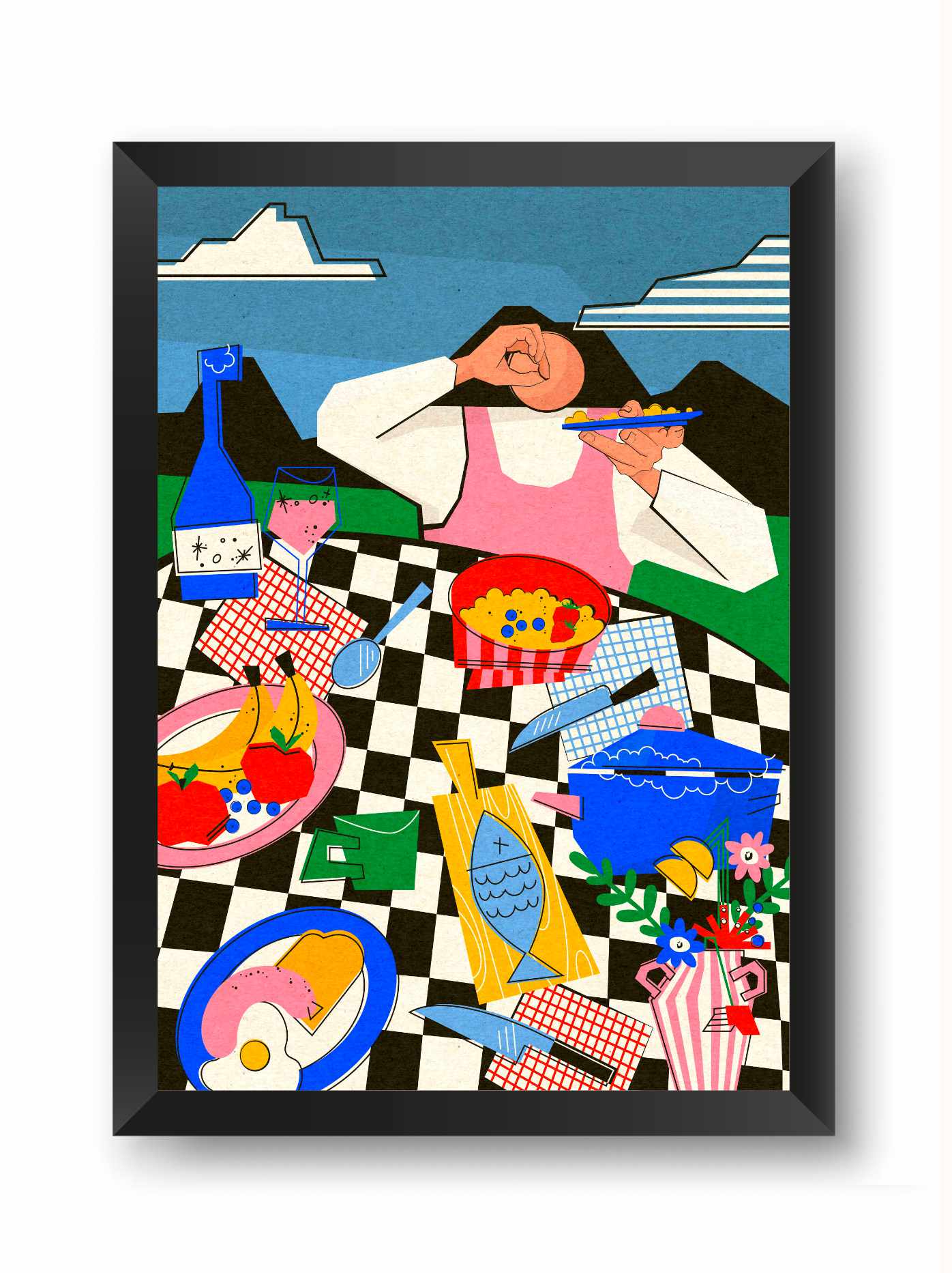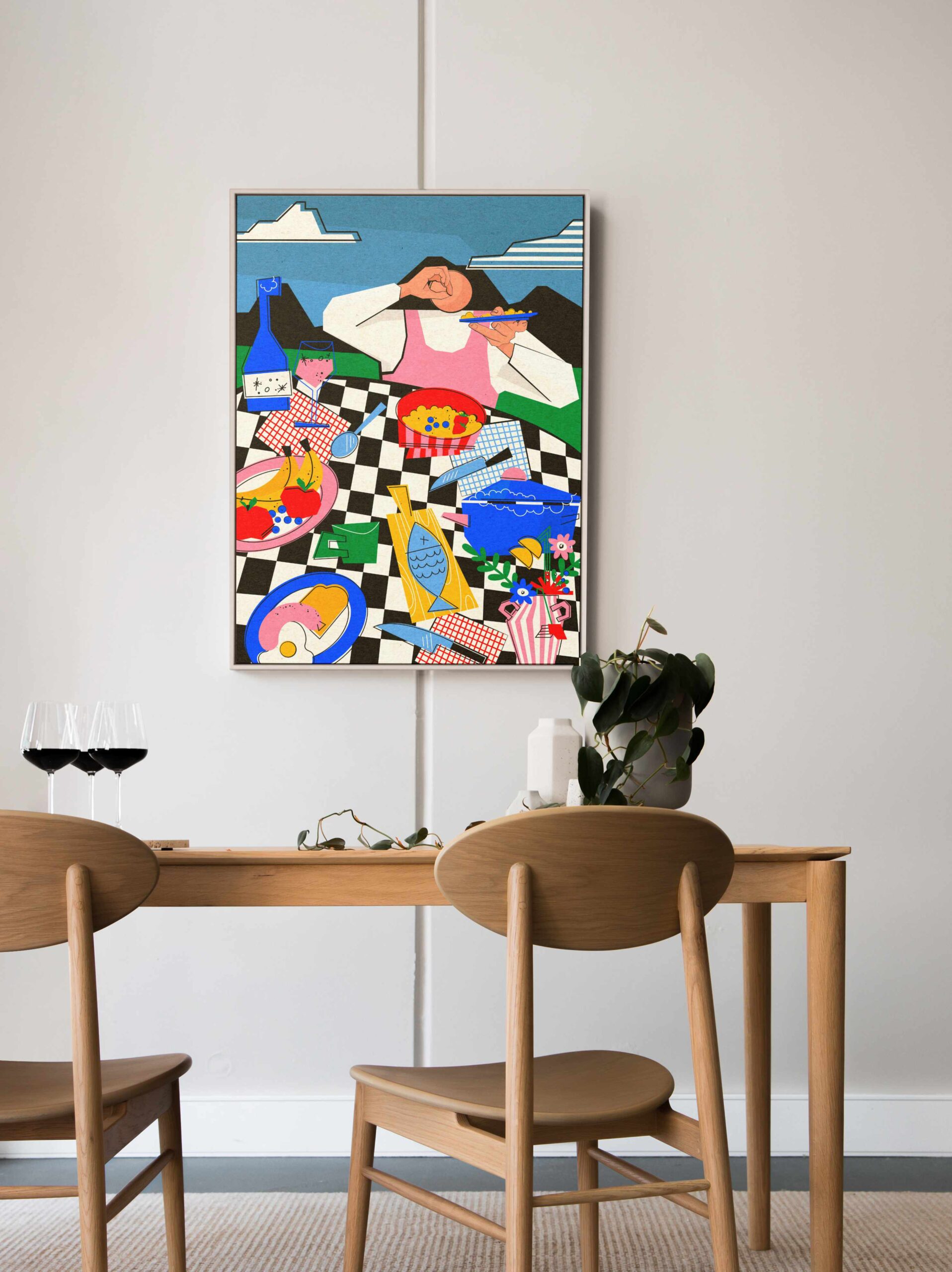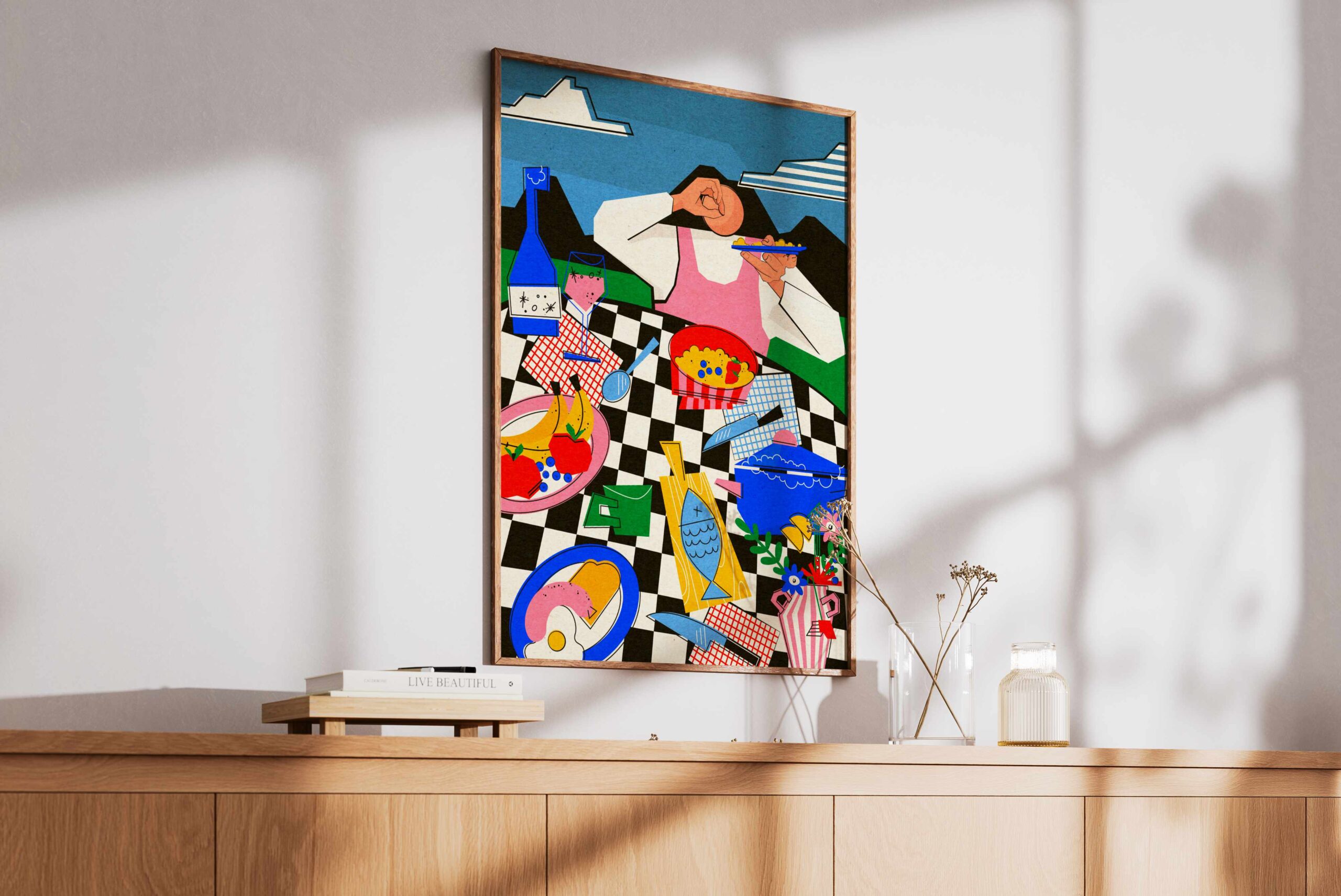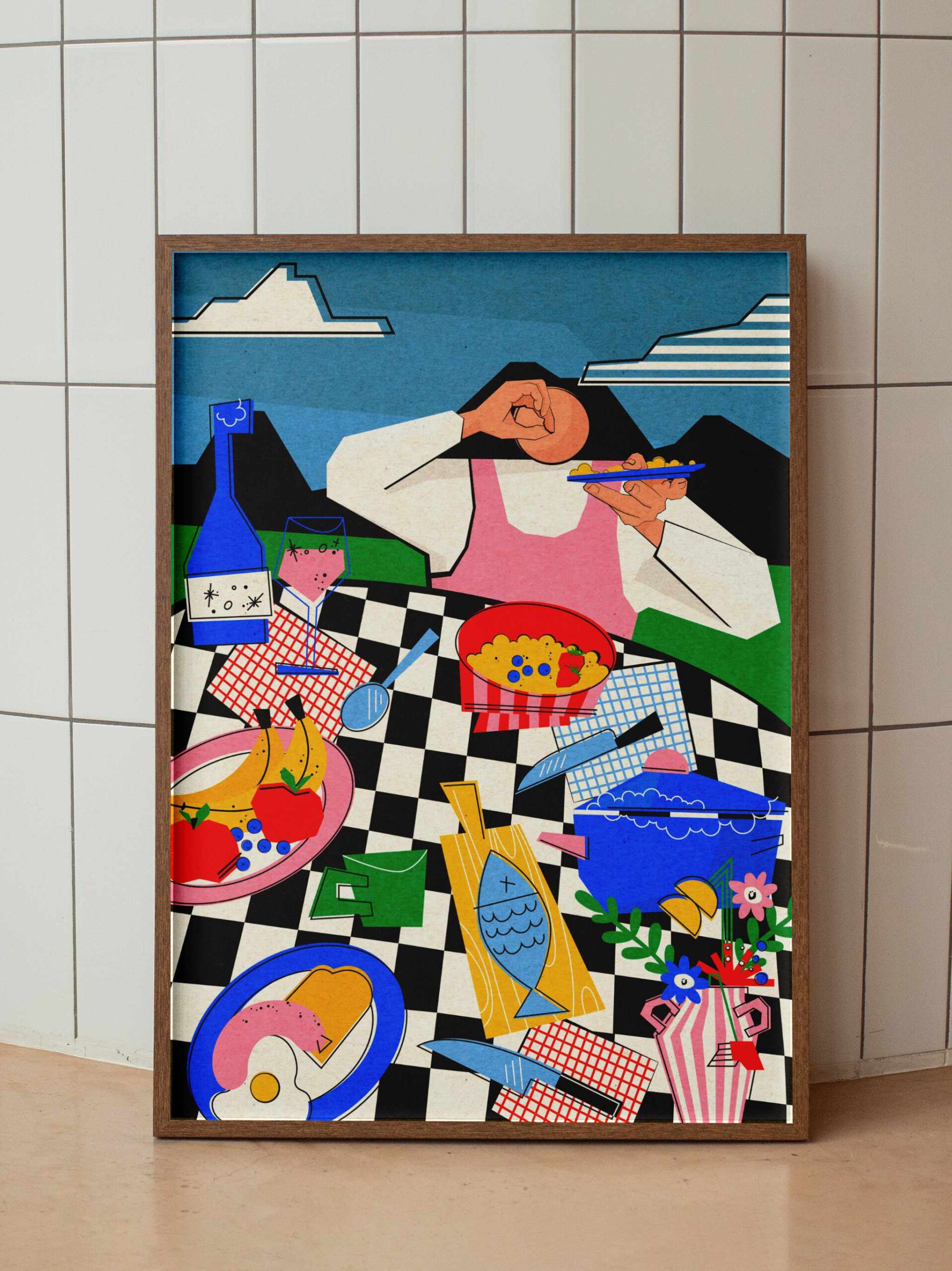Kolorystyka: Odważne połączenie energetycznej czerwieni, głębokiego błękitu i czerni na pastelowym, liliowym tle. Całość oprawiona jest w wyrazistą ramkę w czarno-białą szachownicę.