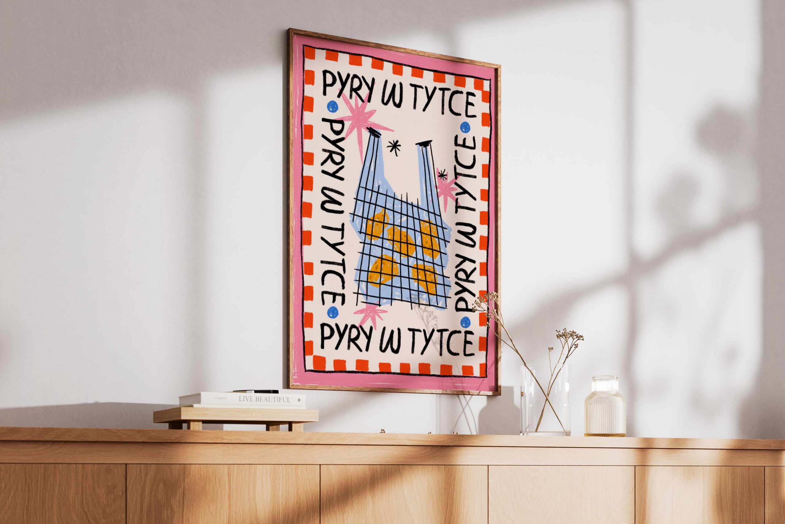 Kolorystyka: Odważne połączenie energetycznej czerwieni, głębokiego błękitu i czerni na pastelowym, liliowym tle. Całość oprawiona jest w wyrazistą ramkę w czarno-białą szachownicę.