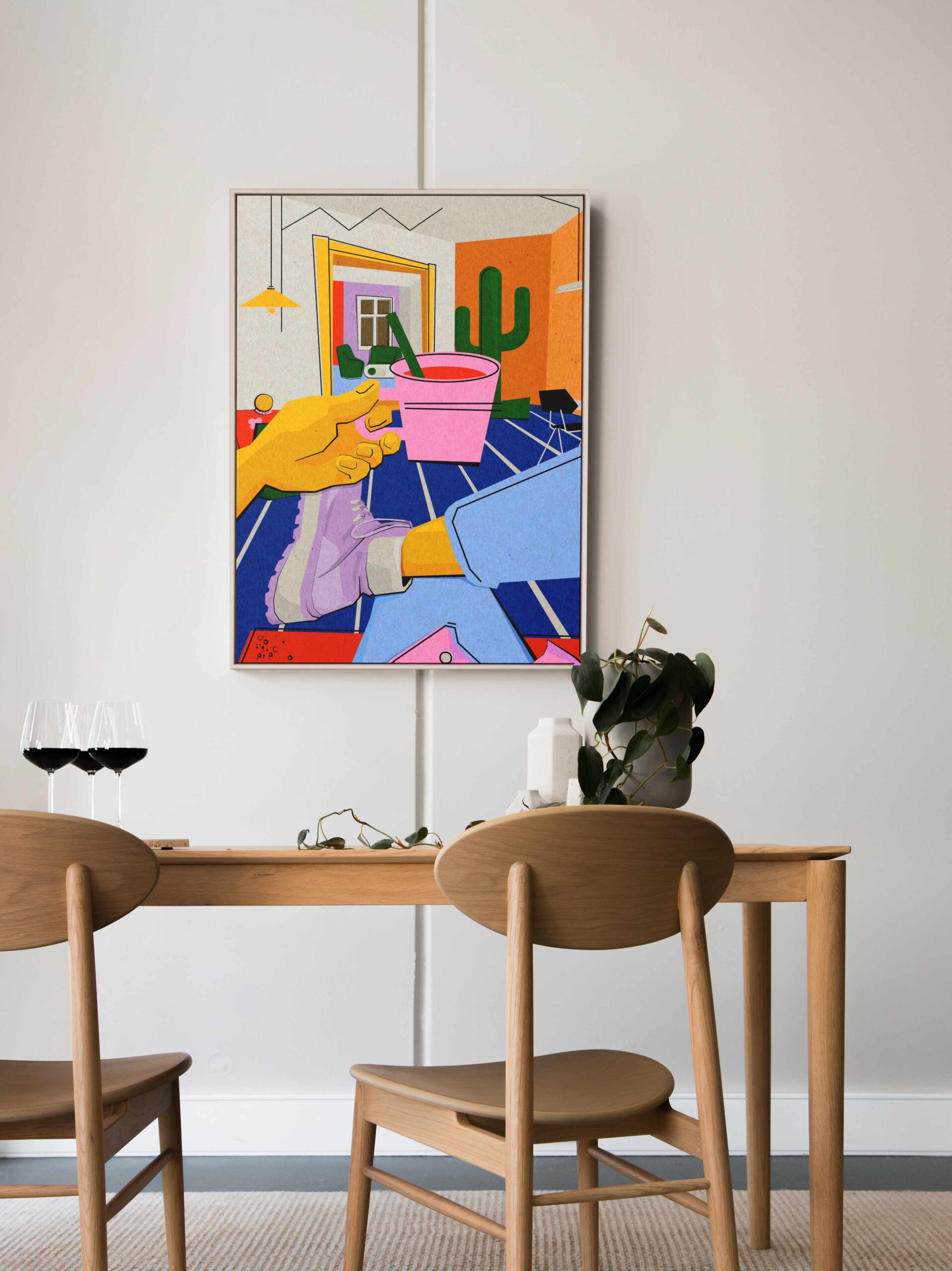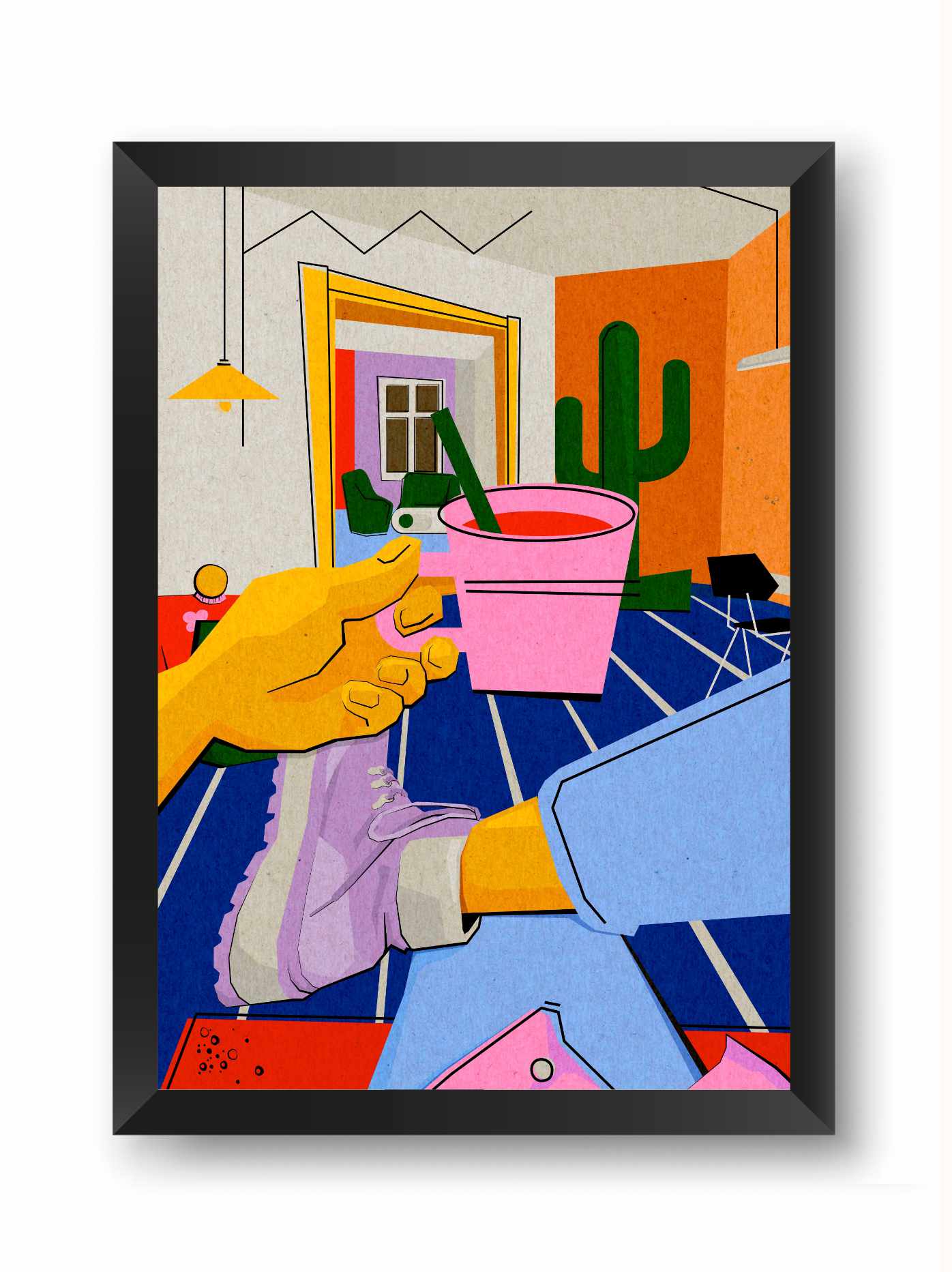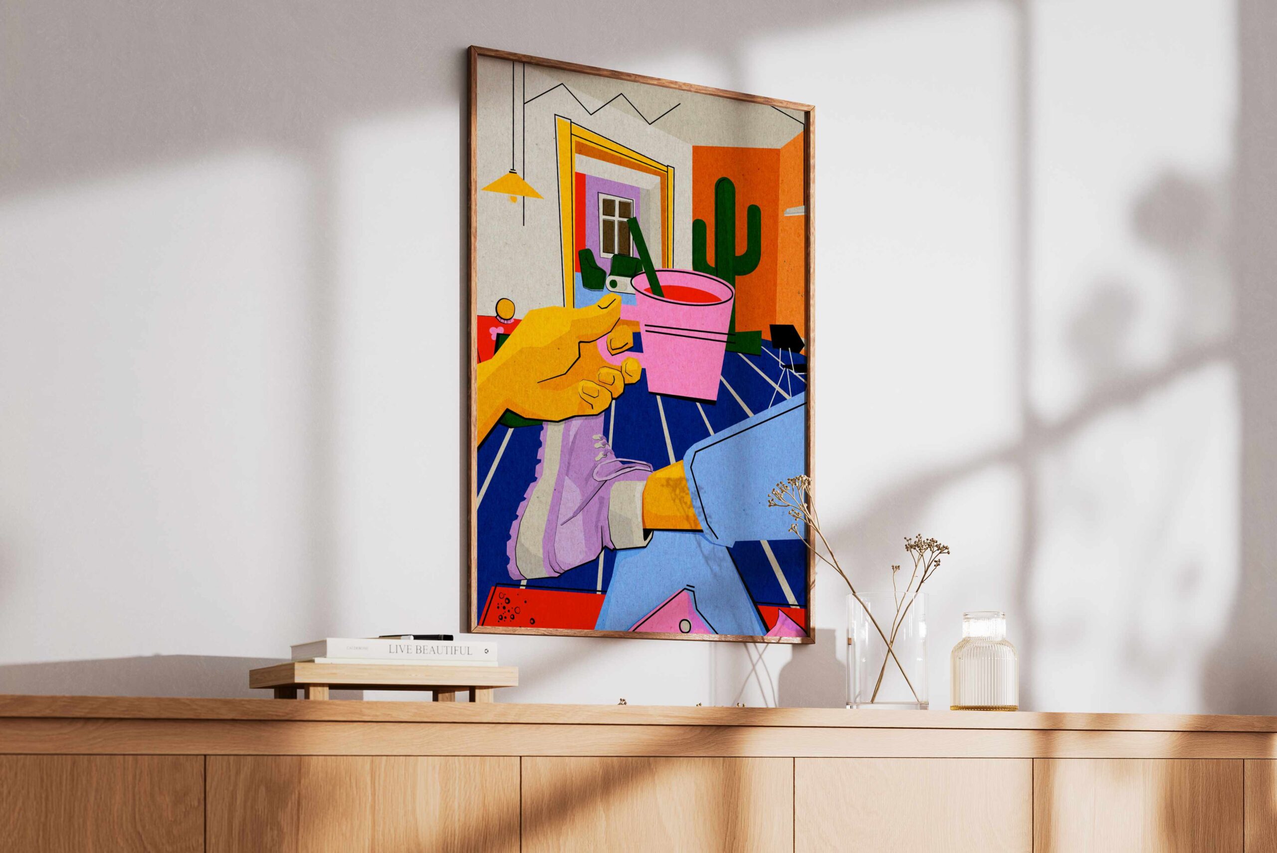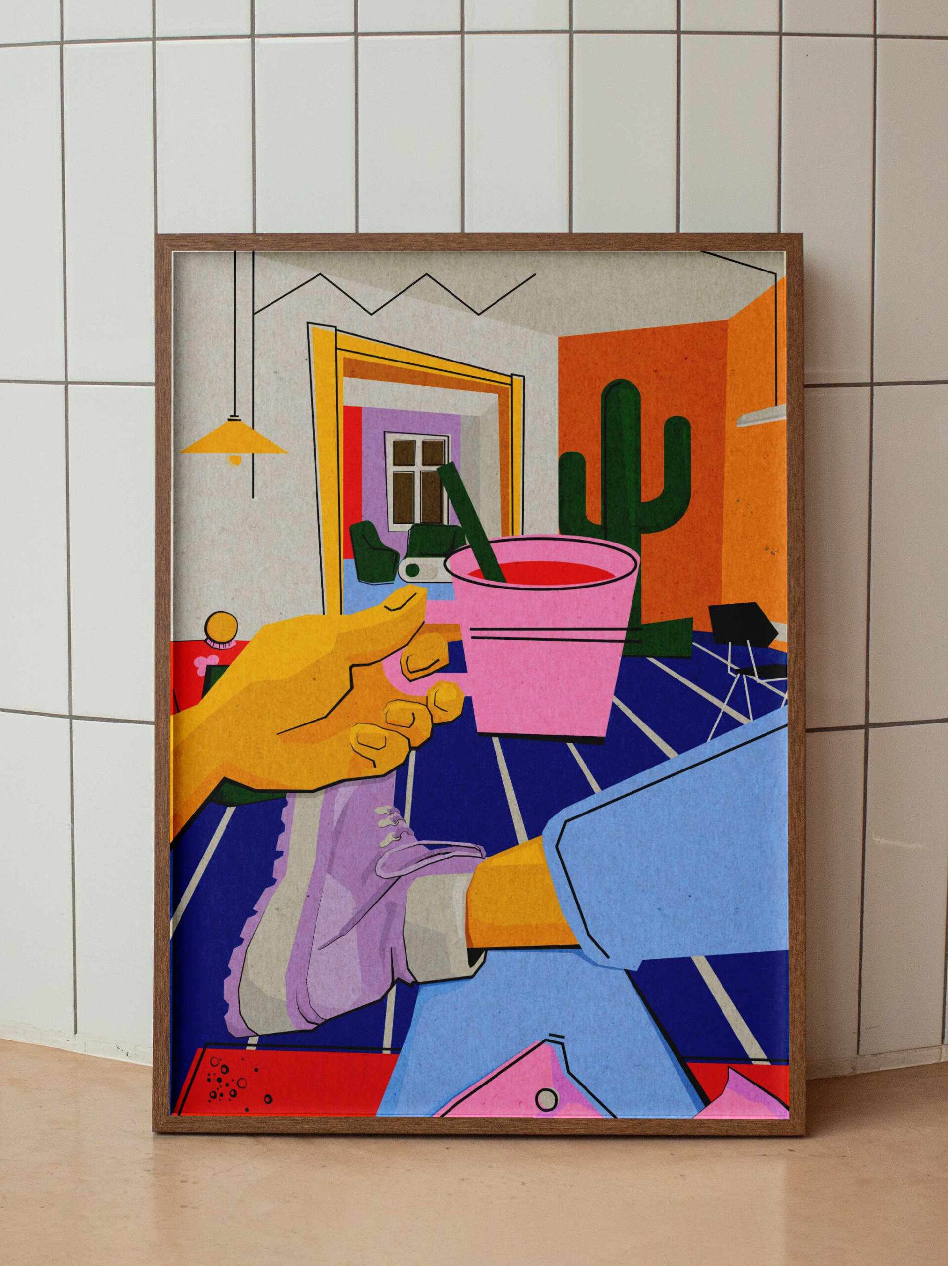 Kolorystyka: Odważne połączenie energetycznej czerwieni, głębokiego błękitu i czerni na pastelowym, liliowym tle. Całość oprawiona jest w wyrazistą ramkę w czarno-białą szachownicę.